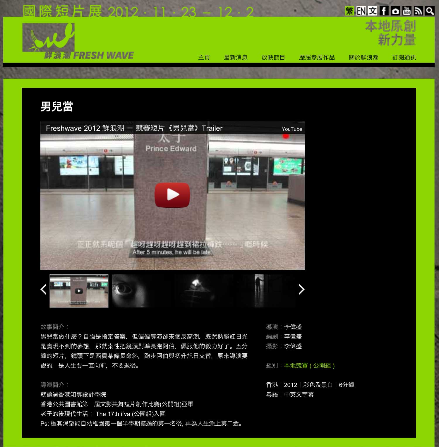 香港藝術發展局主導的《鮮浪潮2012》國際短片節將於十一月廿三日至十二月二日假百老匯電影中心舉行放映。雖然其記者招待會仍未舉行﹐不過在其官方網站裡﹐看來已公佈了今年本地競賽的入圍名單。