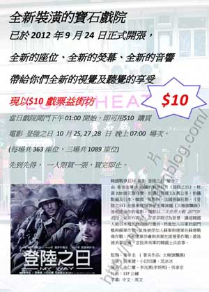 寶石戲院由今天起,選映韓國電影《登陸之日》,選擇於今天、星期六與星期日三天的晚上七時正場次提供特惠戲票,每票只需港幣十元正。有意購買優惠戲票的話,可於戲院下午一時開始營業起購買,每人限買一票,售完即止。