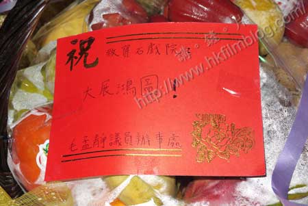 從地下大堂所見,可以看到各大戲院相關團體提供的到賀花牌。