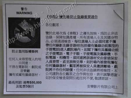 安樂發行的《寒戰》上映在即,而繼月初的首映、周初的傳媒場後,明天將會提供優先場次,並且於下周五的香港亞洲電影節開幕。可是,這些在未開畫前的場次,一律需要作保安檢查。