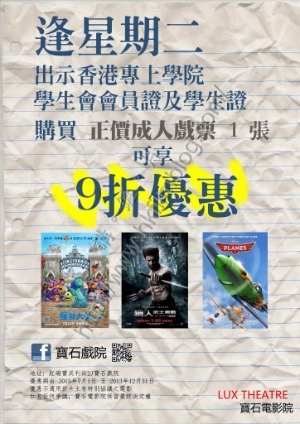 上圖所見,便是來自寶石戲院Facebook的通告,通告指逢星期二只要出示香港專上學院學生會會員証及學生証的話,購買成人戲票,便可以獲得九折的優惠,優惠期直接今年年底為止。