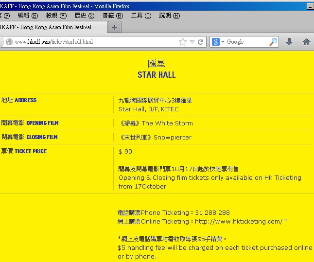 上圖所見,便是來自香港亞洲電影節的官方網頁,指出開幕與閉幕電影於匯星舉行,以網上及電話講票均需收取每張五元的手續費。