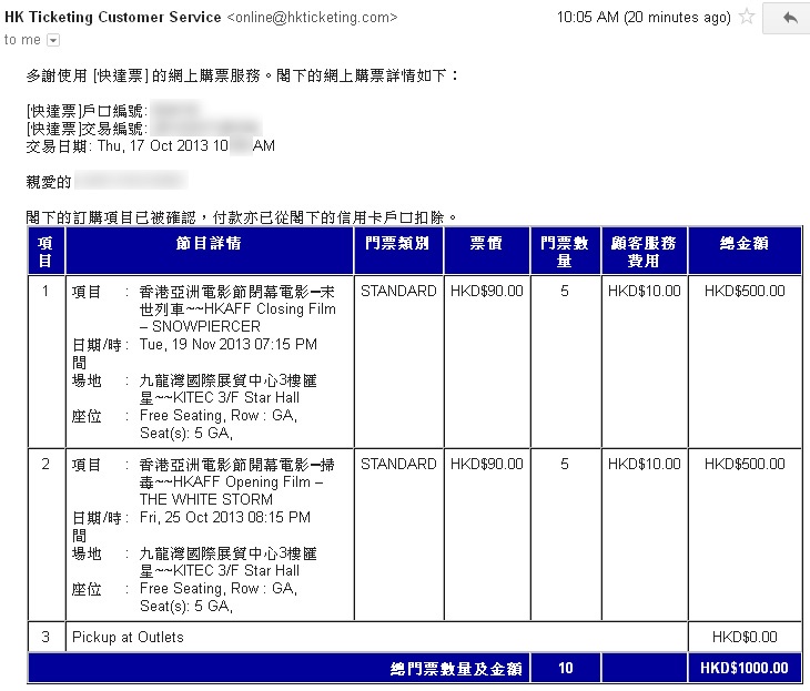 「講。鏟。片」情報人員於今早嘗試透過快達票系統購買開幕電影《掃毒》及閉幕電影《末世列車》的戲票,雖然能夠成功購買,但是收取的「顧客服務費用」卻不是五元,而是十元。以上圖情報人員各買五張計算,收取費用便由五十元增至一百元,增幅超過一倍。