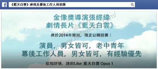 上圖所見,便是電影《藍天白雲》的官方Facebook的通告,當中表示了該片將於2014年開拍,並同時招募片中的九個角色及其各幕後人員,Facebook同時提供了相關的聯絡方法。