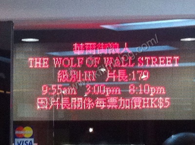 上圖所見,便是「講。鏟。片」情報人員周日於九龍灣淘大影藝戲院所攝,可以看到該戲院於周日放映三場《華爾街狼人》,並標明因片長關係,每票將加價港幣五元。目前影藝戲院的標準票價為港幣五十元,故使該院《華》片的票價為五十五元,比起部分戲院近百元甚至是過百元的票價,可算是十分優惠。