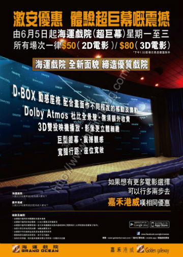 上圖所見,便是嘉禾旗下戲院貼出的票價優惠,可以看到是次優惠重點放在去年年底重新裝修完成的海運戲院,宣傳寫上自六月五日起該院星期一至三的所有場次,2D電影票價為五十元、3D電影票價則為八十元。與此同時,也同時大賣海運戲院的多個賣點,包括不額外收費的杜比全景聲、3D雙投映機等。不過觀乎六月五日為星期四,意味著首個優惠日為下周一,即六月九日。