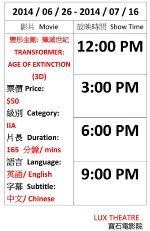 洲立發行的派拉蒙荷里活3D大片《變形金剛:殲滅世紀》今天開畫,由於電影的末段約40分鐘的場景以香港為背景,部分更香港實景拍攝,故此吸引了不少觀眾慕名而來。當大家看到此片的票價高企之時,也許沒想過仍可以有片長不另加價的廉價選擇。