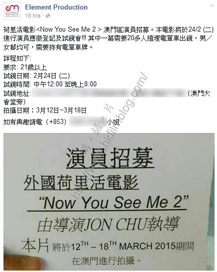 上圖所見,便是來創洺製作有限公司的官方網站,該網站指出「外國荷里活電影」《Now You See Me 2》將於三月十二日至三月十八日期間在港門進行拍攝。由於其中一幕需要同時有廿多年駕駛電單車出鏡,故此該公司於今天進行試鏡。