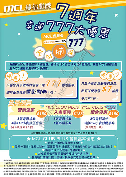 是次MCL德福提供優惠,可以說是分為多個層面,先是為會員咭有「777」字的會員提供免費電影贈券,而在小食部購買食品,便可以七元換購中汽水一杯。