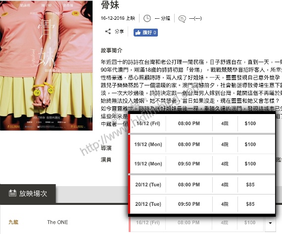 《骨妹》安排於百老匯The ONE上映五場,分別於十二月十六日上映晚上八時正場次,而十二月十九日與二十日則分別各映晚上八時正及晚上九時五十分兩場。
