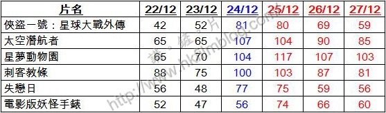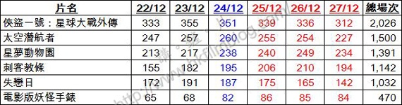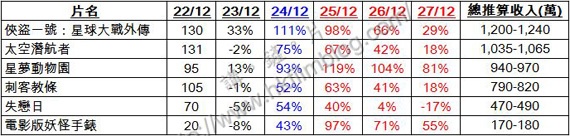 最後從推算收入來看各片走勢,可以看到在聖誕六天假期裡,《俠盜一號》在場次較多與平均票價較高下佔有優勢,再加上聖誕有點家庭客源帶動下,可以看到電影與周四比較的話,於平安夜與聖誕日升幅強勁,最終六天間推算收入以逾千二萬的成績,拋離對手近兩成。
