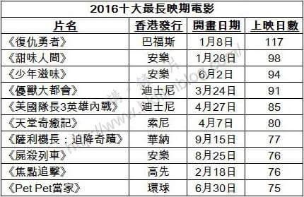 去年映期最耐的電影,要算是巴福斯發行、里奧納度狄卡比奧主演的《復仇勇者》,電影於去年一月八日上映,先後挾著金球獎與奧斯卡的勢頭,最終到五月四日才落畫,期間只有一天並無場次,最終有效上映日期達117天,成為2016年上映映期之最。