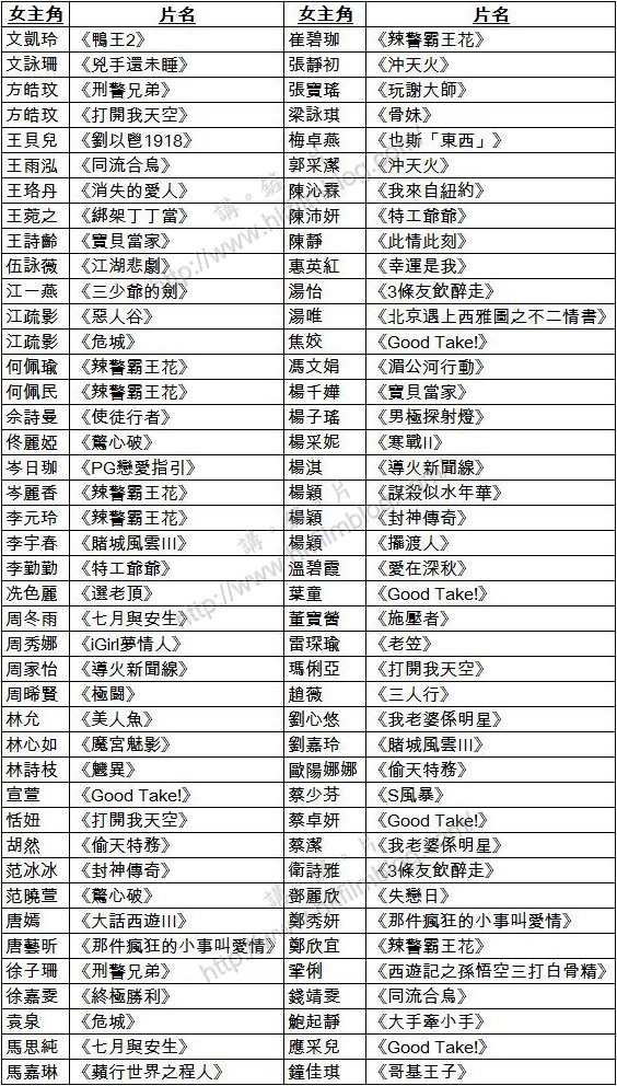 近年來,香港電影缺乏女主角,這點也許可從提名報名名單看到,而今年情況跟去年相若。雖然今年報名電影有68部,可是其最佳女主角的選擇只有84個,看來一眾女角還是需要多加努力。