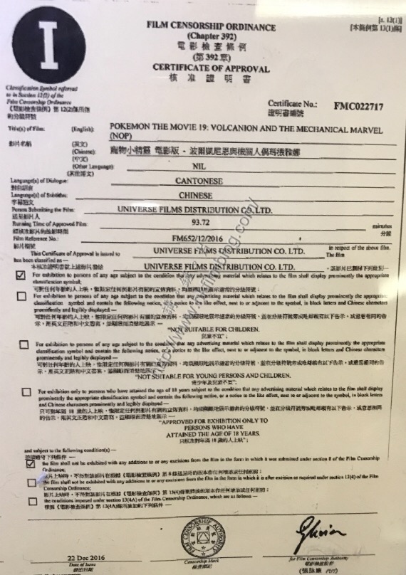 拿回俗稱「電檢紙」的電影檢查條例核准證明書來看,這部電影已由寰宇發行於去年十二廿二日送檢,並獲得「適合任何年齡人士觀看」的一級評級,不過片名卻是《寵物小精靈 電影版 – 波爾凱尼恩與機關人偶瑪機雅娜》。即使不計標點符號的話,全片片名已有廿二個字,相信該是有史以來賀歲片最長的片名。由於片名也不好記,要讀起來真的相當困難。看來要票務員在購票時說出整個片名,也會考起大家吧!