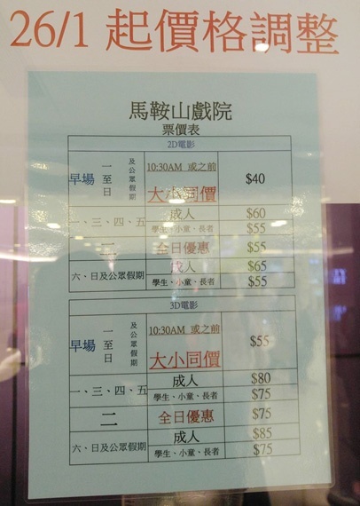戲院經營成本上漲下,難免需要上調票價。當香港部份戲院已於去年聖誕開始上調票價時,位於馬鞍山廣場獨立營運的馬鞍山戲院在經營成本上漲上,也於今天開始上調票價。