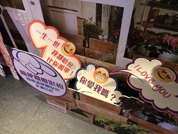 看看可拿來合照的紙版,當中共有三款,包括了「I LOVE YOU」、「你愛我嗎」及「一生一世我都唔會比你孤單!」,而用後可以放回原處供其他觀眾使用。