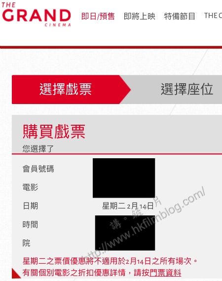 即使是九龍站The Grand,同樣寫上「星期二之票價優惠將不適用於2月14日之所有所次」。