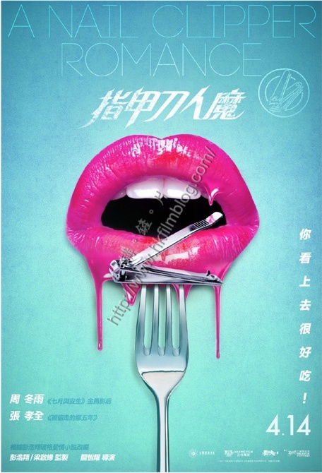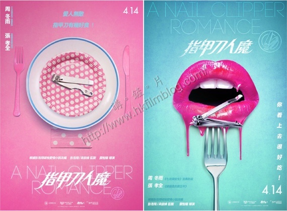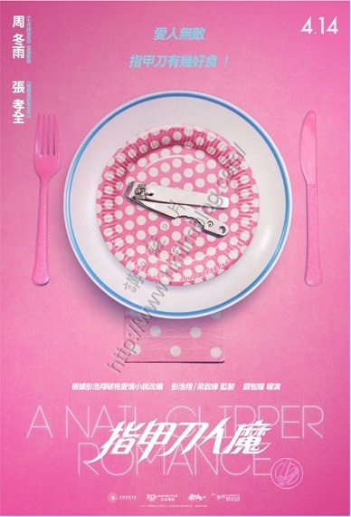 是次《指甲刀人魔》海報共有兩款,分別以粉紅色及粉綠色作為主題。當中粉紅色的一款以餐桌上的餐具為主題,粉紅色的餐布配上粉紅色的刀叉,而碟上卻放了一個指甲鉗,並且寫上「愛人無敵、指甲刀有幾好食!」的宣傳字眼。左上角則寫上兩位主角周冬雨與張孝全的名字,右上角則寫上「4.14」的字眼,意味著電影將於四月十四日在港上映。電影合演的演員還包括鄭伊健、許瑋甯、謝依琳、盛朗熙、林辰唏及納豆。