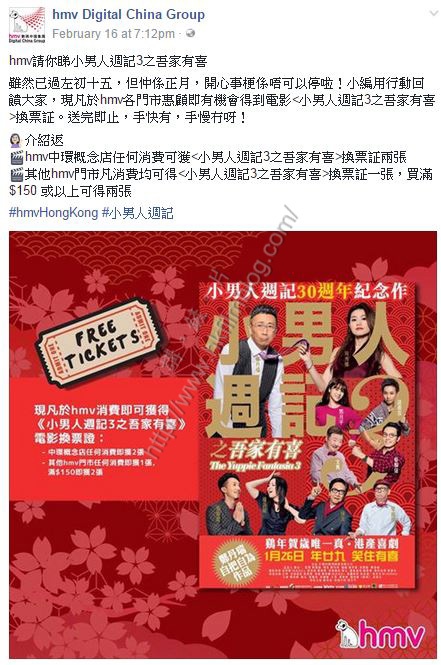 從HMV數碼中國集團的Facebook官方專頁看到,該集團於二月十六日晚上貼出通告,指在旗下HMV影視店門市消費,便可獲得《小男人週記3之吾家有喜》換票証。「講。鏟。片」情報人員於周末作出測試,發現只需要在HMV以九元購買Snickers一包,一樣送上換票証。