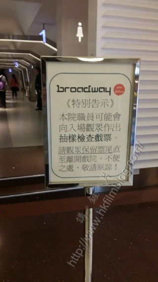 與朋友研究後才發現原來院方用心良苦:由於一至六院基本上是位於同一條走廊,有些人在觀影途中借用洗手間後一時不察很容易就會「入錯院」甚至逃票,為免造成困擾才會豎立這個告示牌。只是去洗手間也未必會帶著戲票,所以院方最好清楚說明「戲票必需隨身攜帶」方可實際地解決問題。