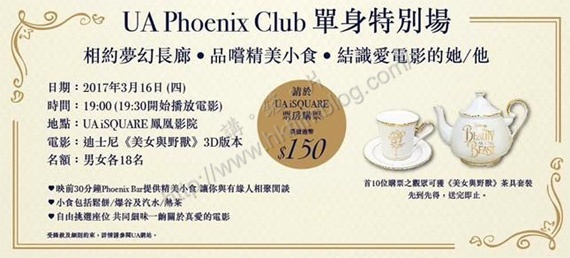 電影俠的本尊(月老)日前接到線報,UA iSQUARE 鳳凰戲院(Phoenix Club)將為迪士尼真人電影《美女與野獸》3D版推出單身特別場,時間為3月16日星期四晚,19:00開始小食供應讓參與者可以跟「有緣人」相聚閒談,並且於19:30開始電影放映,根據官方宣傳海報的寫法是「男女各18名」,並且「自由挑選座位 共同欣賞一齣關於真愛的電影」。戲院為電影開單身特別場次並不是首例,之前星影匯也曾經拿《LEGO蝙蝠俠英雄傳》在2月14號來試水溫,當然主要仍是噱頭居多。
