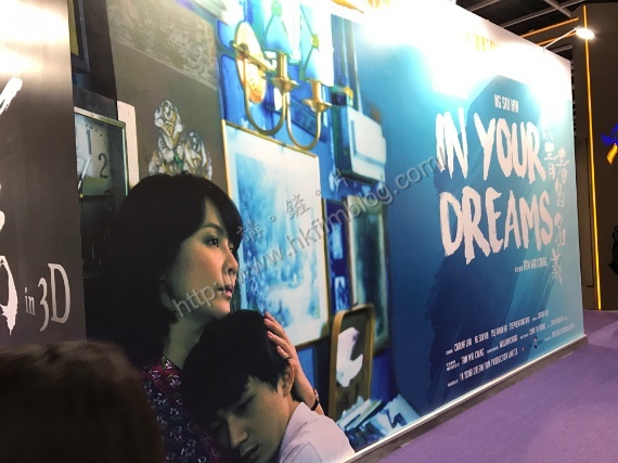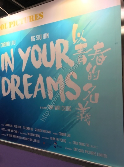 上圖所見,便是在香港國際影視展天下一電影的攤位所見,可以看到以藍色背景的《以青春的名義》宣傳。在圖片看到穿上校服的吳肇軒正於仿如穿上旗袍的劉嘉玲懷中。
