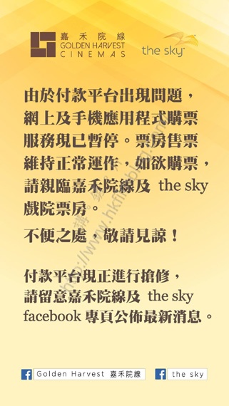 上圖所見,便是嘉禾院線於今天下午四時許在其Facebook張貼的通告,指因為付款平台出現問題,網上及手機應用程式購票服務均已暫停,觀眾需要親臨戲院票房購票。觀乎周四便開始預售周末的戲票,倘若觀眾真的要選到合適的座位,變相就要下班上前往各嘉禾戲院,感覺相當麻煩,而且浪費時間。