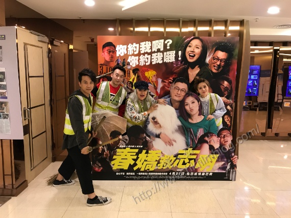 原來,在屯門的這個宣傳品,看到有著在《春嬌救志明》演出的邵音音,不過邵音音更有趣的是穿上《救殭清道夫》的宣傳制服。原來當時音音姐正於戲院進行謝票活動,也順道為《春嬌救志明》宣傳一下。