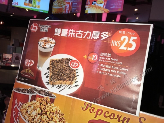 「講。鏟。片」情報人員於周日跟進謝票時,來到葵芳百老匯戲院,發現該戲院推出「雙重朱古力厚多」,當中標榜以KitKat來製作,售價為25元一客,同時加10元更可換取原價28元的熱飲如美式咖啡、牛奶咖啡或朱古力等。