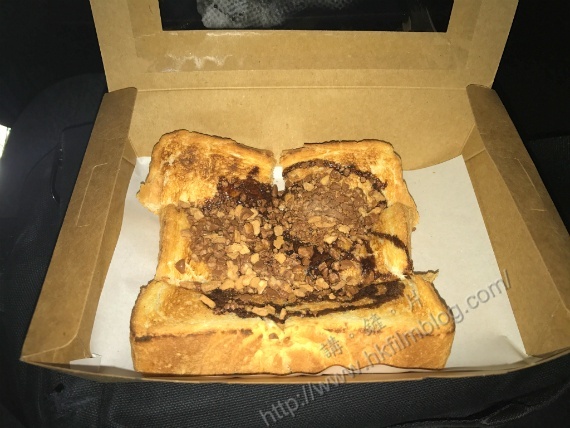 情報人員當場購買一客,當中「雙重朱古力厚多」與咖啡均為即製款式,需時大約五分鐘左右。而徰上圖所見,多士以包裝盒盛載,而多士上佈满了由KitKat碎組成的醬料。多士也算厚,味道也算是不俗,跟茶餐廳不相伯仲。奉上時除了提供膠叉外,還有紙巾與濕紙巾,相當體貼。另一方面,多士也切成六小份,方便以叉來進食。