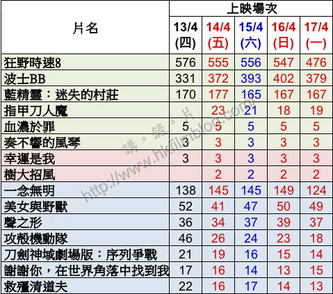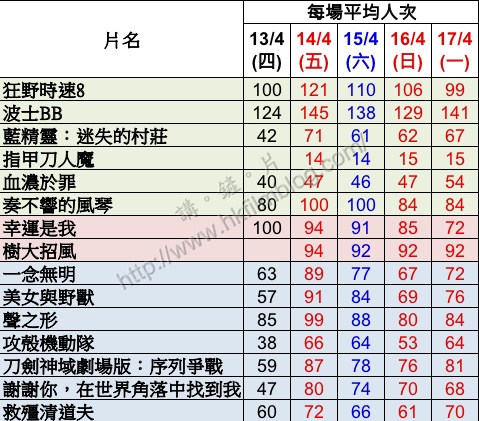 先從上映場次方面來看,環球發行的《狂野時速8》在場次上佔優,不過卻出現近乎在假期裡遞減的情況。而周一跌幅更超過百分之七。反觀福斯發行的《波士BB》在首天錄得高入座後,隨即增場一成,而在周日更達頂峰四百場,其後回落百分之五。而另一部由索尼發行動畫《藍精靈:迷失的村莊》在整個檔期維持約170場上下,當中周一假期最後一天當其他電影場次回落時,仍保持平穩。兩部周四開畫的新片場次不多,故此高先發行的《血濃於罪》與第一發行《奏不響的風琴》對市場影響有限。而周五上映由巴福斯發行的《指甲刀人魔》,在開畫表現不佳下,場次已在假期有所減少。