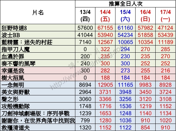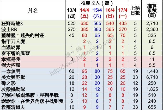 而在考量不同電影場次不同版本的組合,則可推算其收入,當中可以看到《狂野時速8》的周一成績因為場次與入座場大幅回落下,推算收入下跌近兩成。但是畢竟初段表現強勁,五天推算仍在2710萬以上。而《波士BB》在推算收入平穩下,跟《狂》片的距離亦由最初的250萬,縮窄至昨天只差約65萬,而五天連同優先場則在2360萬左右,繼後走勢能否有望超越《狂》片則要看平日走勢與假日爬升。而《藍精靈:迷失的村莊》在同期《波士BB》開畫下明顯受到影響,當中只有假期首天約在80萬左右,五天推算在325萬,令人有點失望。