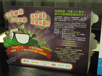 隨著3D電影盛行,3D眼鏡需求也甚殷,當中百老匯及UA兩組主要院線以環保及衛生為理由,採用「請君入甕」的方法先免費派3D眼鏡,其後開始不再派發,為一眾戲院帶來3D眼鏡非經常性收入兼降低清潔成本。至於其餘兩家主要院線則繼續可自選購買3D眼鏡或繼續使用借用服務。