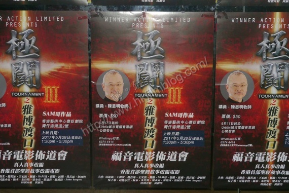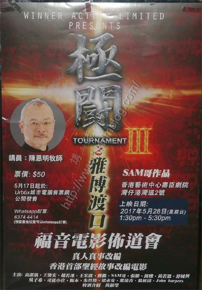 《極闘III之雅博渡口》福音電影佈道會於今天下午一時半假香港藝術中心壽臣劇院舉行,票價一律五十元,各位對於Sam哥電影感到興趣的朋友,宜把握最後機會先行觀賞好了。