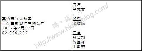 根據電影發展基金的資料顯示,《冥通銀行大劫案》於今年二月十七日已獨電影發展基金資助二百萬港元,電影由梁啟緣監製,而演員陣容則跟去年初版海報一樣,由彭浩翔與曾國祥主演,而在最新資料,亦顯示女主角為王敏奕。而最初宣傳以「人做我唔做,打劫陰屍路」作為口號,相信是走喜劇路線。
