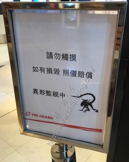 上圖所見,便是「講。鏟。片」情報人員日前於九龍站The Grand所見,可以看到該戲院的其中一出現一個告示,當中「請勿觸摸,如有損毀,照價賠償」是十分常見。不過令人感到奇怪的,便是出現一句「異形監視中」。