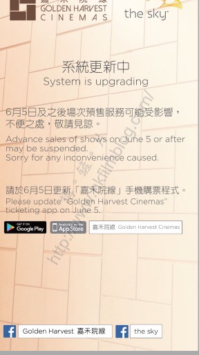 另一方面,便用嘉禾院線的手機應用程式購票的話,同時獲得溫馨提示,指該系統正在更新當中,並指可能影響六月五日或之後的預售服務,同時也請觀眾於明天更新嘉禾院線的手機應用程式。