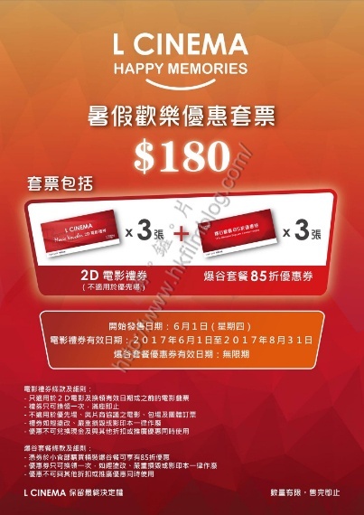 L Cinema的「暑假歡樂優惠套票」每套包括三張2D電影禮券,以及三張爆谷套餐八五折優惠券,前者可於今年六月一日至八月三十一日期間使用,而後者則不設有限期限。而每套套票承惠港幣一百八十元,意味著平均票價少於六十元。不過要留意的是電影不適用於優先場,而部份跟片主有協議的電影也不適用。