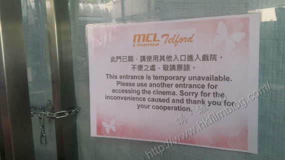 上圖所見,便是「講。鏟。片」情報人員在剛過去的周末於MCL德福戲院所攝,可以看到該戲院的其中一個入口處已經封閉,並且舖上白色的膠布圍封。同時部份入口寫上需使用其他入口進入戲院。