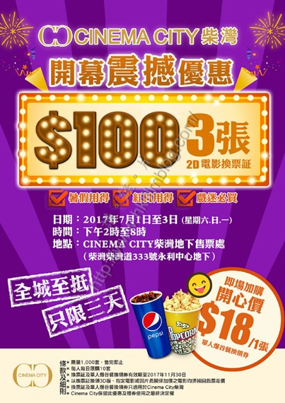 有關套票將於七月一日至三日下午二時至八時期間於Cinema City柴灣戲院地下售票處發售。套票限量一千套,而每人每日限購十套。