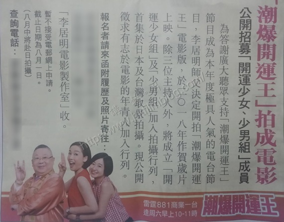 上圖所見,便是來自昨天報章的廣告,廣告指為答謝聽眾支持《潮爆開運王》節目,李居明決定開拍《潮爆開運王》電影版,並將於明年賀歲檔期上映。而三位主持除會演出,同時也徵求年青男女成為「開運少女組」與「少男組」。觀乎用字寫上「首集」,意味著該電影也許成為系列電影,而首部則會於日本及台灣取景。