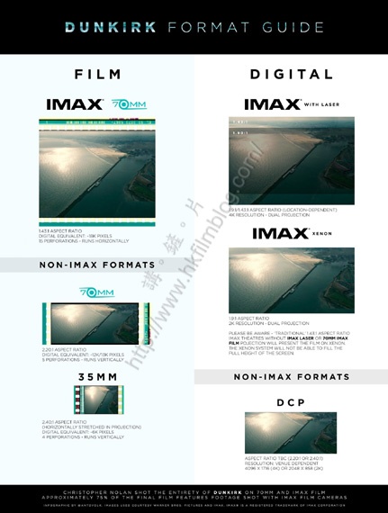 華納發行的戰爭題材電影《鄧寇克大行動》今天已在香港上映,由於電影屬於Christopher Nolan的新作,故此不少觀眾也來期待。雖然香港只推出了一般數碼拷貝(D-Cinema,俗稱「DCP」)及數碼IMAX版本,但實際上卻有更多版本。