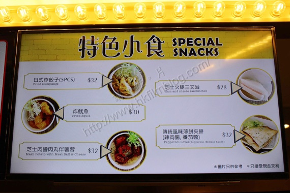 上圖所見,便是「講。鏟。片」情報人員於Cinema City柴灣戲院小食部所見,可以看到該戲院共推出了五款特色小食,售價由二十八元到三十二元不等。當中包括日式炸餃子、炸魷魚、芝士肉醬肉丸伴薯蓉、芝士火腿三文台及傳統風味薄餅夾餅。其款式過去並沒有Cinema City朗豪坊發售,可以說是為Cinema City柴灣而設。