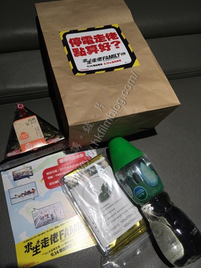 上圖所見,便是驕陽發行《求生走佬Family》提供的「求生走佬包」。在紙皮袋的包裝下,除了提供了電影資料外,還有應急毛毯一張、蒸餾水一支及飯團一個。而食品上可算是相當落本,因為當中的品牌也算是有名。而紙袋上則貼上「停電走佬點算好?」的字眼。