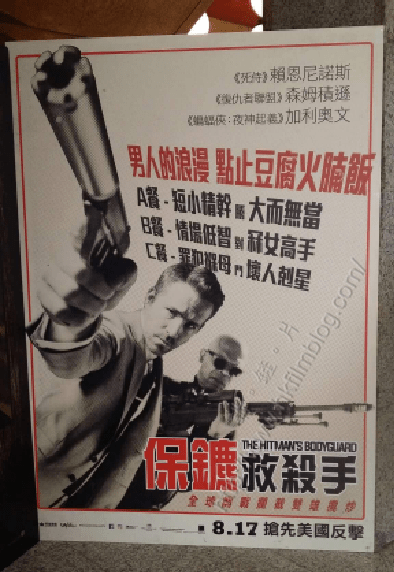 英皇與娛藝聯合發行的《保鑣救殺手》將於八月十七日在香港上映,而電影過去在宣傳代便有惡搞奇雲高士拿經典電影《護花傾情》。不過要吸納更多香港觀眾,在宣傳也要來「本地化」。而上圖所見,便是「講。鏟。片」情報人員日前於旺角豪華戲院地下大堂所攝,可以看到《保鑣救殺手》的大型宣傳紙板。雖然句語則外地版相若,但宣傳用語卻變成「男人的浪漫,點止豆腐火腩飯」。而當中還提供了三款套餐,三款有著不同的比拼用字,但是也作強烈對比,以形容電影裡的保鑣與殺手的角色。