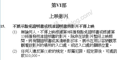根據《電影檢查條例》(香港法例第392章)第VI部「上映影片」第15(1)條,影片整段上映期間,將有關證明書或其清晰影印本,展示在用以容納觀眾觀看該影片的場所的入口處,或近入口處的顯眼位置。而根據第15(2)條,任何人違反第(1)款的規定,即屬犯罪,經定罪後,可處罰款$10,000。