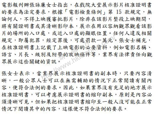 而就戲院展示《電影檢查條例核准證明書》事宜,也曾於兩年前香港政府與戲院商營商聯絡小組第二十二次會議作出討論,當時電影、報刊及物品管理辦事處首席娛樂事務管理主任(電影)張詠廉女士便指出核准證明書上記載了上映電影的必要資料,業界有法律責任向觀眾展示這些關鍵的資訊。同時張女士亦指出,展示原則為內容必須清晰可見,並指出但如果把核准證明書縮印至一般人沒可能在正常情況下閱讀其中的內容,這樣便不符合法例的要求。