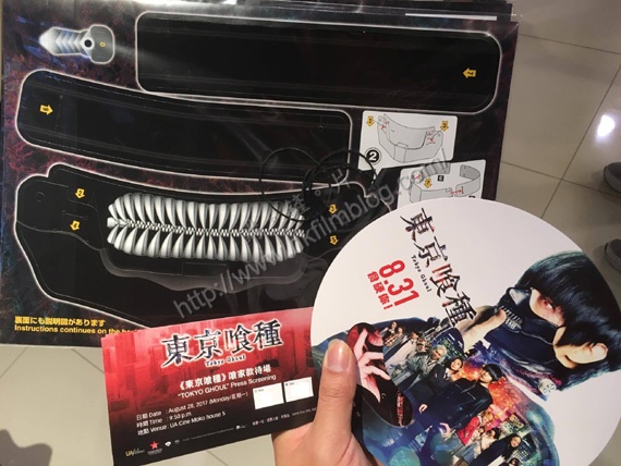 《東京喰種》屬漫畫真人化改編電影,而電影於日前舉辦優先場,可以看到當中的禮品除了近年在電影宣傳常見的扇外,還有一款紙的面罩,並且提供了步驟,如何可以透過摺疊的方式成為一個面罩。