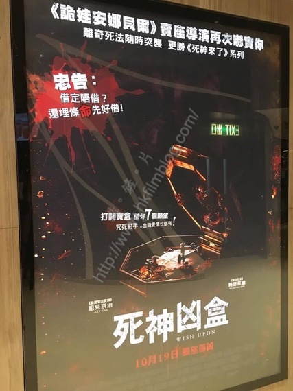 原來上述的宣傳用語,是來自洲立發行將於十月十九日上映的恐怖題材電影《死神黑盒》。電影題材以打開神秘寶盒提供打開者一共七個願望,但是卻要付上性命來作出代價。如斯的情節,用上這樣的宣傳字眼,可以說是相當配合,看來洲立發行在宣傳上,真的花了一點心思吧!