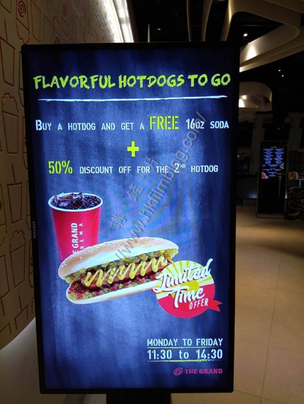 上圖所見,便是「講。鏟。片」情報人員於昨天晚上於九龍站The Grand所攝,可以看到該戲院的屏幕顯示該戲院小食的最新優惠,凡於周一至周五早上十一時半至下午兩時半,凡購買熱狗一隻,便可以獲得免費十六安士汽水一杯。而同時再買第二隻熱狗的話,第二隻熱狗可獲半價優惠。